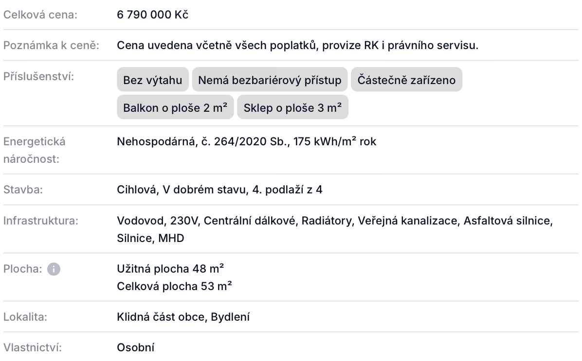Nabízíme k prodeji byt v osobním vlastnictví o celkové podlahové ploše 48,36 m², ke kterému náleží balkón o výměře 2,12 m² a sklepní kóje o velikosti 3 m² umístěná v přízemí domu. Jednotka se nachází v posledním podlaží udržovaného bytového domu bez výtahu. Byt je v původním stavu a představuje tak ideální příležitost pro budoucího vlastníka upravit si vše plně podle svých představ. Dispozičně je nemovitost řešena jako dvě samostatné obytné místnosti, dále je zde chodba, toaleta, koupelna a kuchyně. V současné době je byt pronajat solventnímu nájemníkovi, který by v případě dohody mohl v nájmu pokračovat.