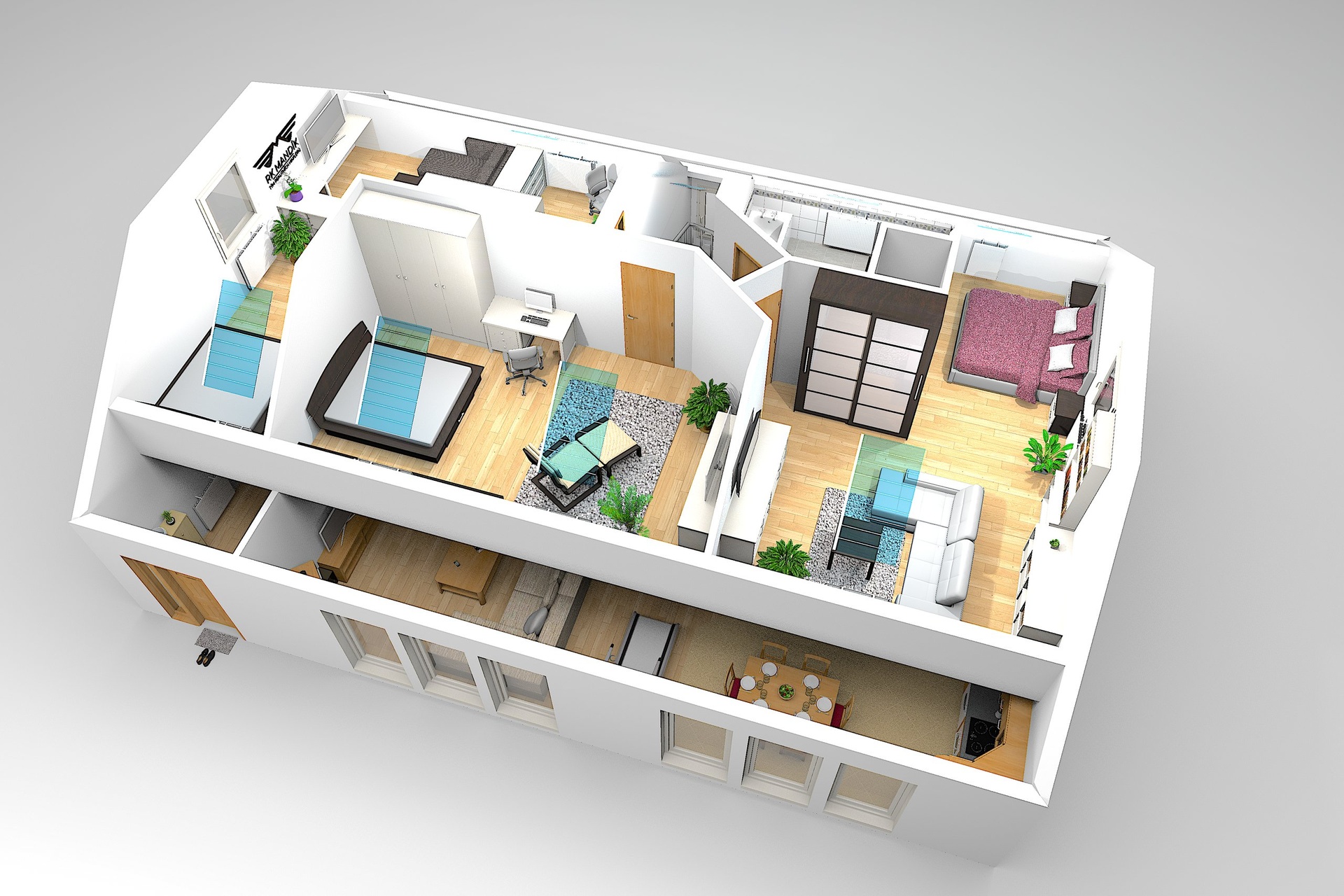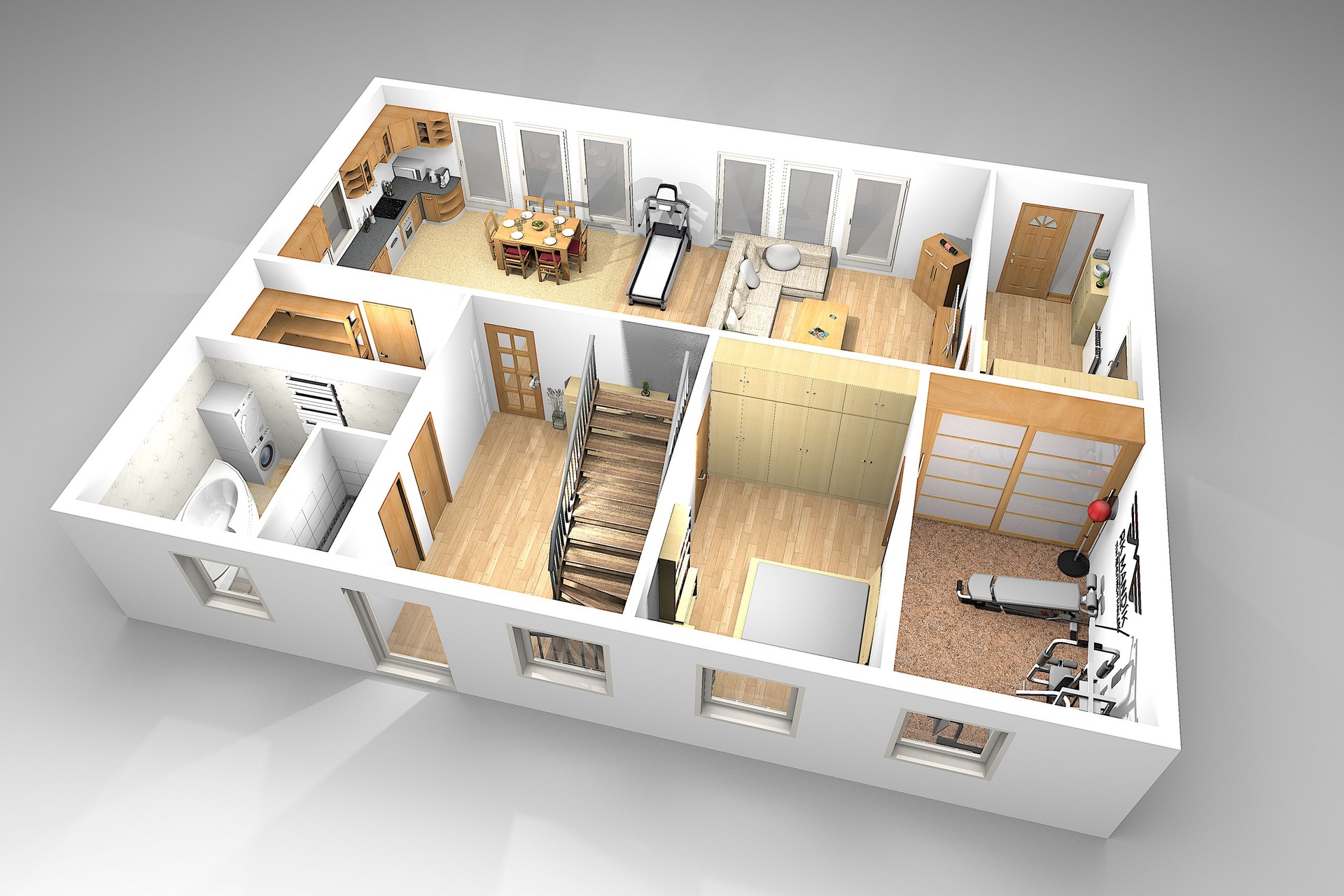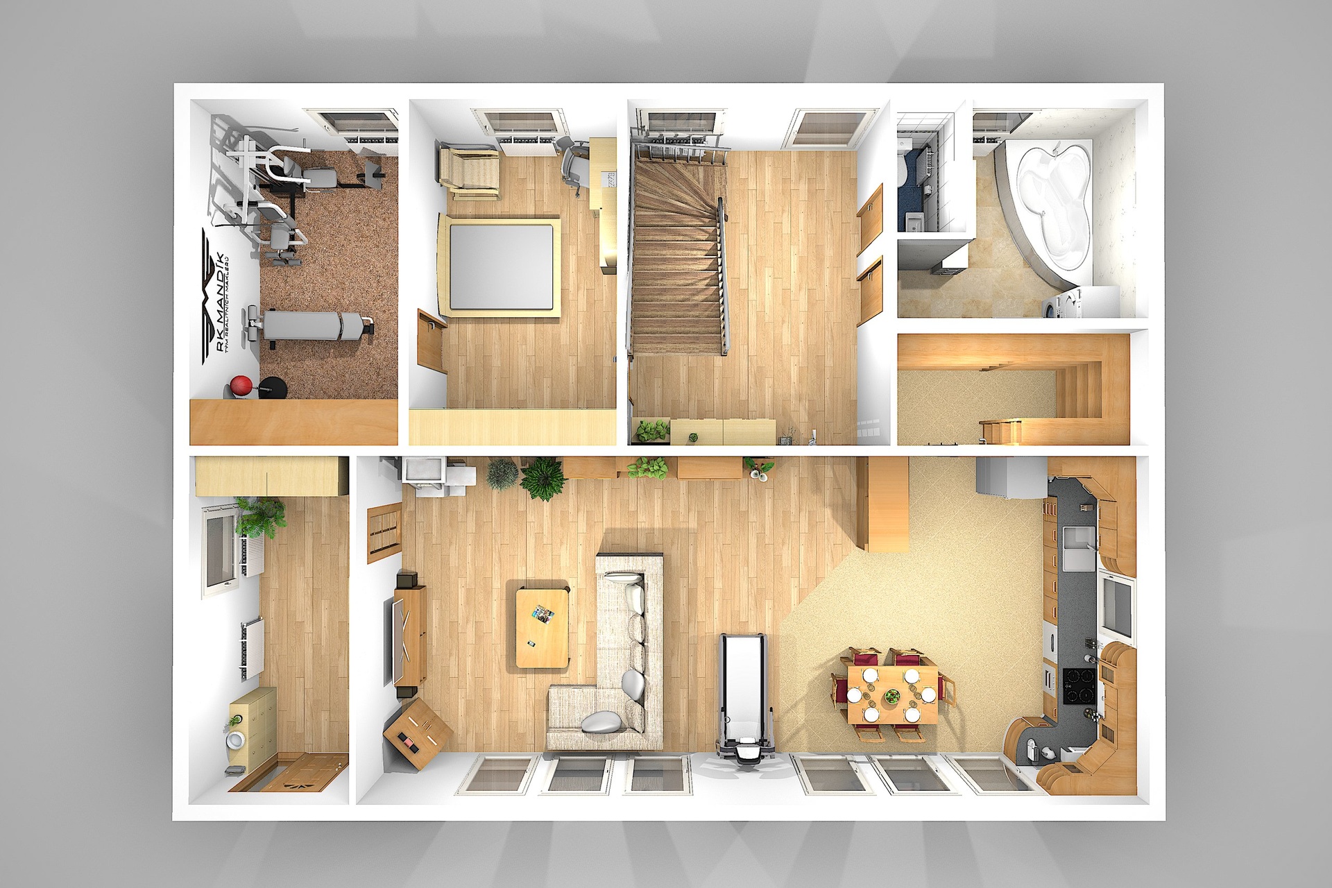 V 1. nadzemním podlaží se nachází zádveří (10,56 m²), rozlehlý obývací pokoj s kuchyňským koutem (52,56 m²), dva samostatné pokoje (13,80 m²), chodba se schodištěm (17,47 m²), samostatné WC (1,75 m²), koupelna s rohovou vanou (8,64 m²) a praktická spíž (5,60 m²).