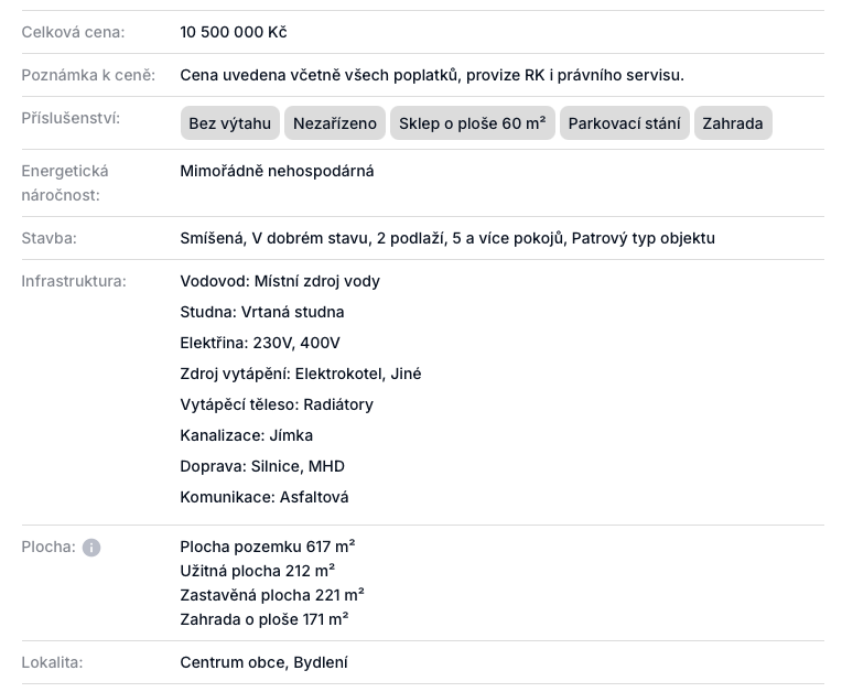 Nemovitost představuje zajímavou příležitost pro ty, kteří hledají dům s duší a potenciálem pro vytvoření skutečně osobitého rodinného zázemí v dojezdové vzdálenosti od Prahy.