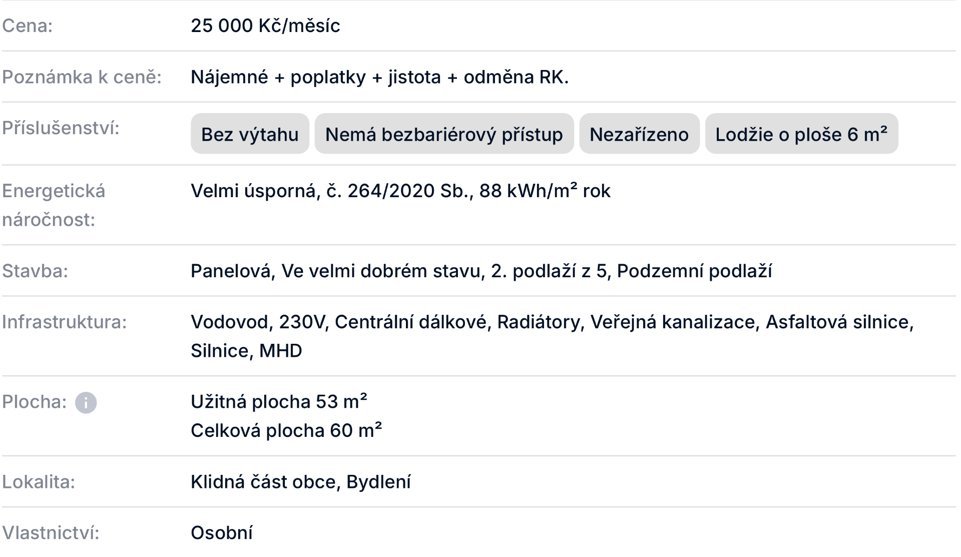 Byt se nachází ve druhém nadzemním podlaží, tedy v prvním patře, panelového domu, který prošel rekonstrukcí. Parkování je možné před domem v rámci rezidentního systému. Majitel upřednostňuje seriózní, stabilní a dlouhodobé nájemníky, kteří ocení kvalitní stav nemovitosti i příjemné bydlení v této lokalitě.