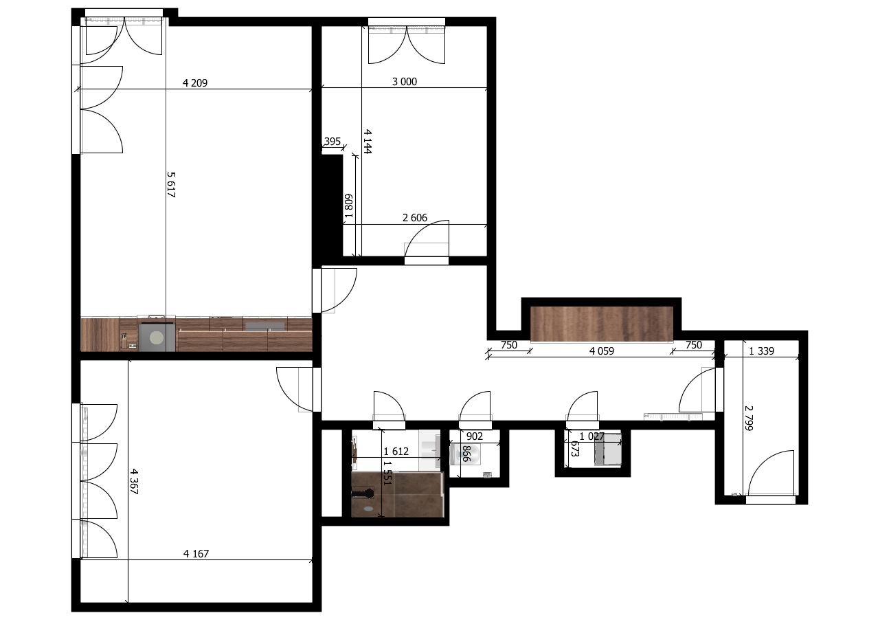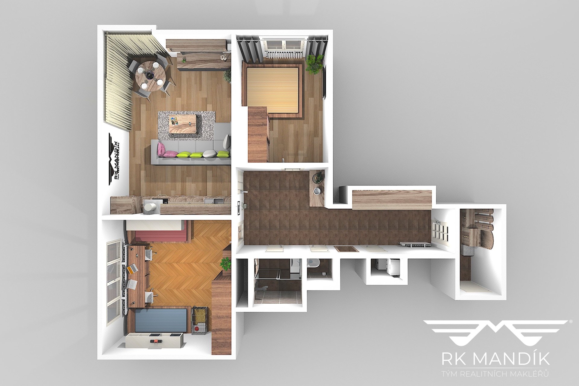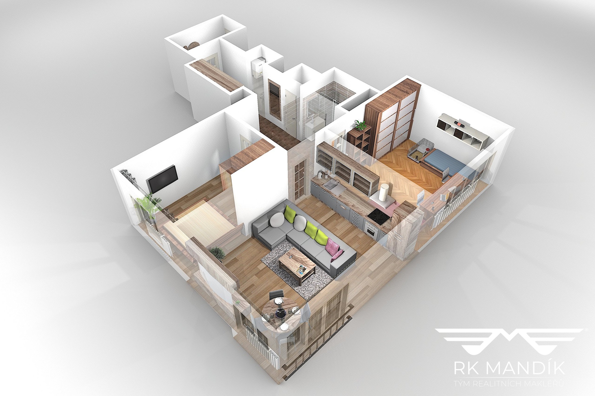 Dispozice je řešena prakticky – obývací pokoj s kuchyňským koutem tvoří přirozené centrum domácnosti. Kuchyňská linka je k dispozici včetně vestavných spotřebičů: lednice s mrazákem, indukční varná deska, digestoř, myčka nádobí a elektrická trouba. Obývací část je zařízena sedací soupravou, konferenčním stolkem, jídelním stolem se židlemi a TV stěnou.