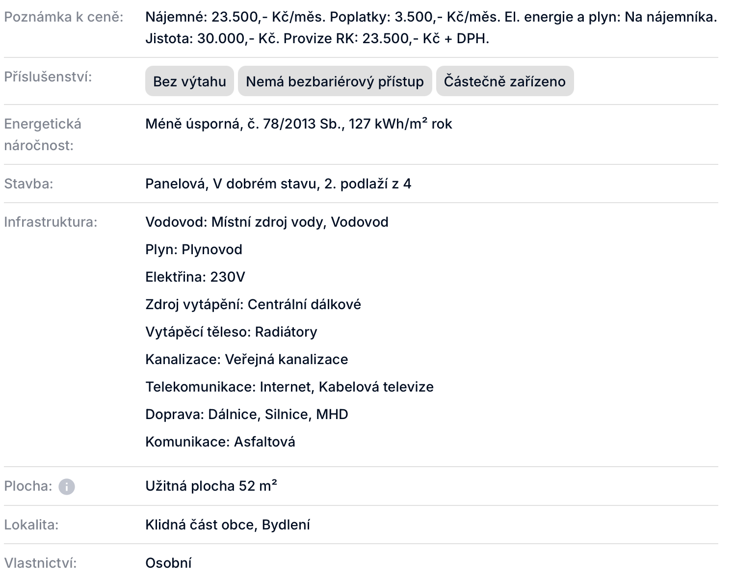 Pokoje mají nové podlahy (kromě obývacího pokoje) a jsou zařízeny základním nábytkem dle fotografií. Koupelna s toaletou je vybavena sprchovým koutem, koupelnovým nábytkem a nechybí ani pračka. Byt se nachází ve druhém nadzemním podlaží, tedy v prvním patře udržovaného panelového domu. Parkování je možné v okolí domu v rámci rezidentního systému. Majitel upřednostňuje nekuřáky bez domácích mazlíčků. Případné výjimky jsou možné po předchozí individuální dohodě s majitelem (s ohledem na charakter bytu, sousedy a pravidla domu). Žádosti posuzuje majitel individuálně.