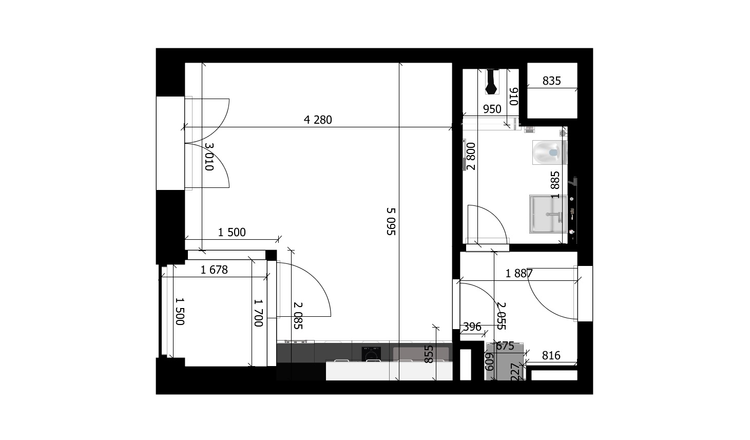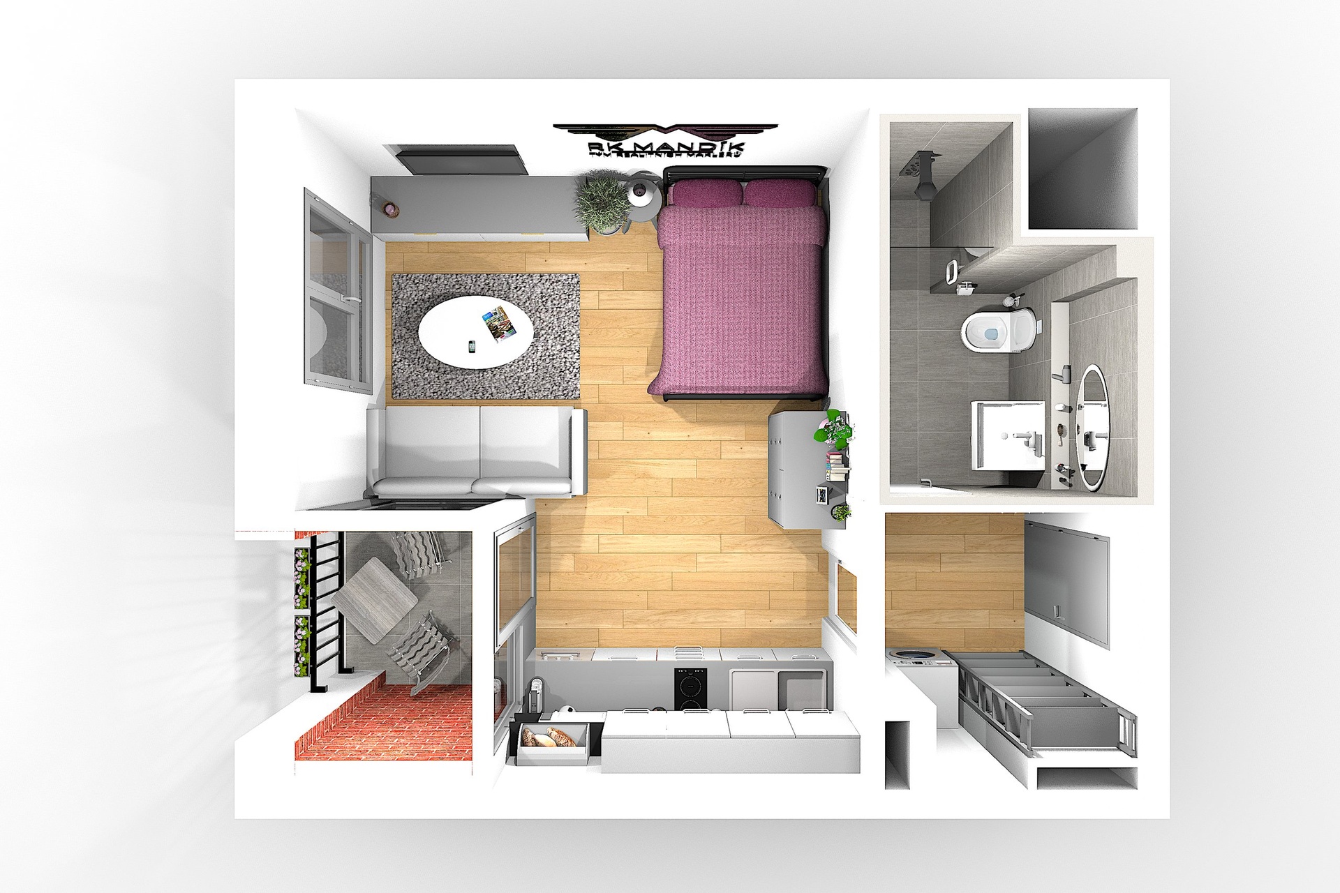Popis bytu: Byt tvoří obývací část s moderní vestavěnou kuchyňskou linkou, zádveří s praktickým prostorem pro pračku a koupelna se sprchovým koutem a toaletou. Interiér je kompletně zařízený a připravený k okamžitému nastěhování.