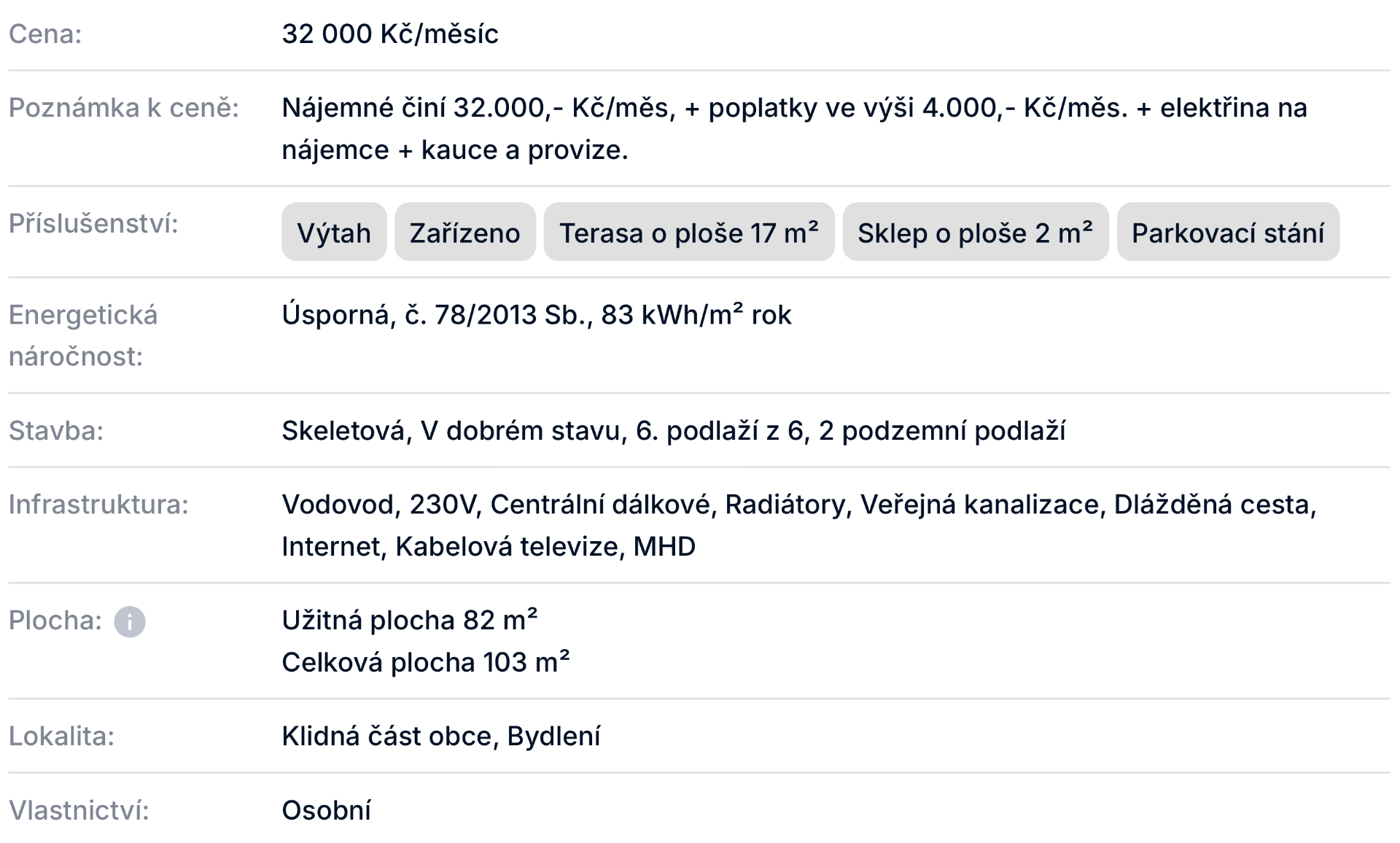 Nájemné: 32.000,- Kč/měs. Poplatky: 4.000,- Kč/měs. El. energie: Na nájemníka. Kauce (jistota): 64.000,- Kč. Provize RK: 32.000,- Kč včetně 21% DPH. Smlouva: 1 rok s možností prodloužení. K dispozici od 1.5.2026.